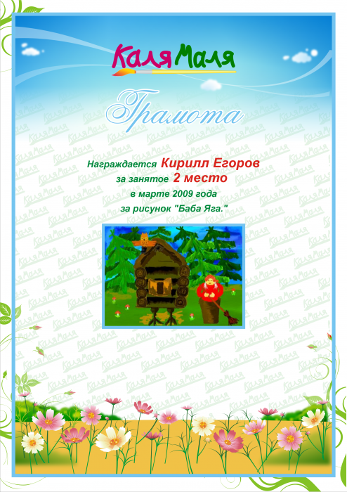 Награждается Кирилл Егоров за занятое 2 место в марте 2009 года за рисунок "Баба Яга."