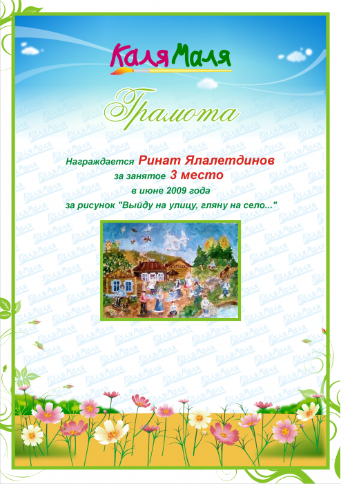Награждается Ринат Ялалетдинов за занятое 3 место в июне 2009 года за рисунок "Выйду на улицу, гляну на село..."