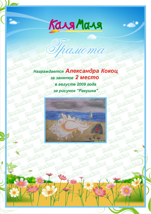 Награждается Александра Кокоц за занятое 2 место в августе 2009 года за рисунок "Ракушка"