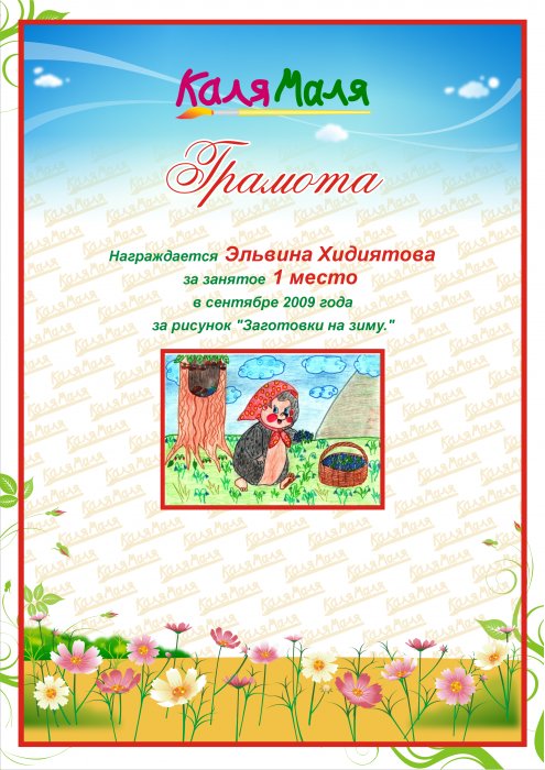 Награждается Эльвина Хидиятова за занятое 1 место в сентябре 2009 года за рисунок "Заготовки на зиму."