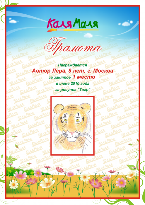 Награждается Автор Лера, 8 лет, г. Москва за занятое 1 место в июне 2010 года за рисунок "Тигр"