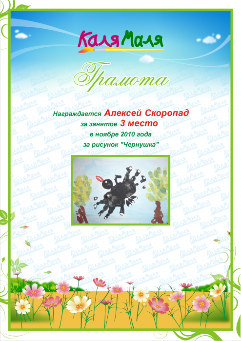 Награждается Алексей Скоропад за занятое 3 место в ноябре 2010 года за рисунок "Чернушка"