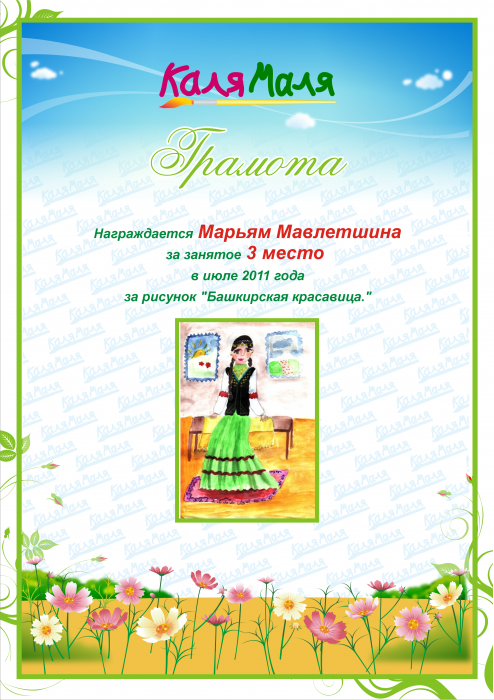Награждается Марьям Мавлетшина за занятое 3 место в июле 2011 года за рисунок "Башкирская красавица."