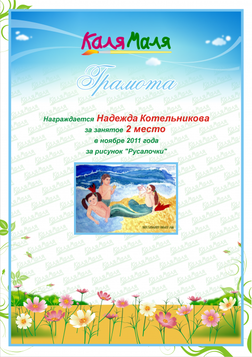 Награждается Надежда Котельникова за занятое 2 место в ноябре 2011 года за рисунок "Русалочки"