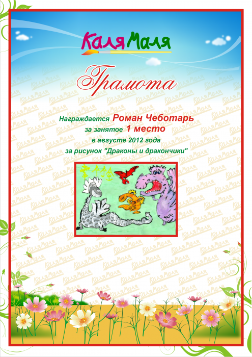 Награждается Роман Чеботарь за занятое 1 место в августе 2012 года за рисунок "Драконы и дракончики"