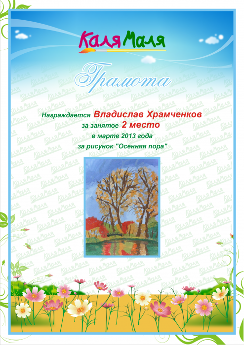 Награждается Владислав Храмченков за занятое 2 место в марте 2013 года за рисунок "Осенняя пора"
