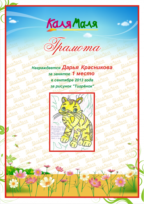 Награждается Дарья Красникова за занятое 1 место в сентябре 2013 года за рисунок "Тигрёнок"
