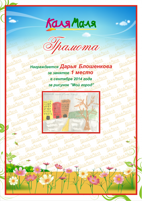 Награждается Дарья Блошенкова за занятое 1 место в сентябре 2014 года за рисунок "Мой город"