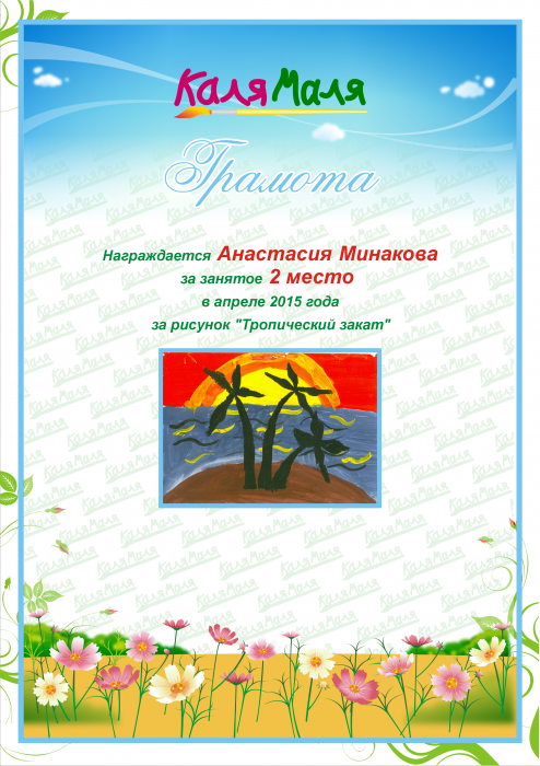Награждается Анастасия Минакова за занятое 2 место в апреле 2015 года за рисунок "Тропический закат"