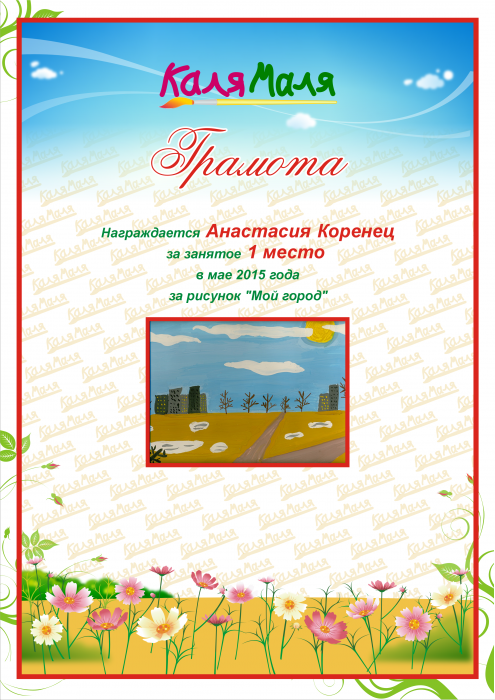 Награждается Анастасия Коренец за занятое 1 место в мае 2015 года за рисунок "Мой город"