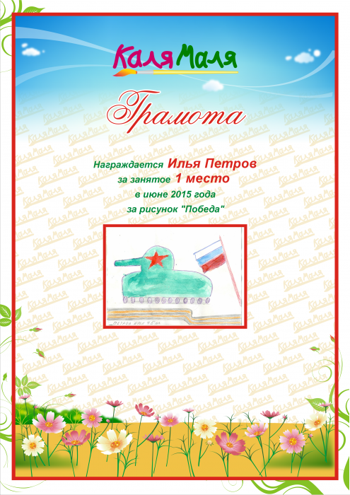 Награждается Илья Петров за занятое 1 место в июне 2015 года за рисунок "Победа"