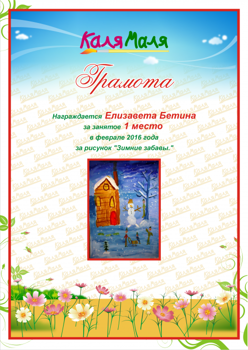 Награждается Елизавета Бетина за занятое 1 место в феврале 2016 года за рисунок "Зимние забавы."