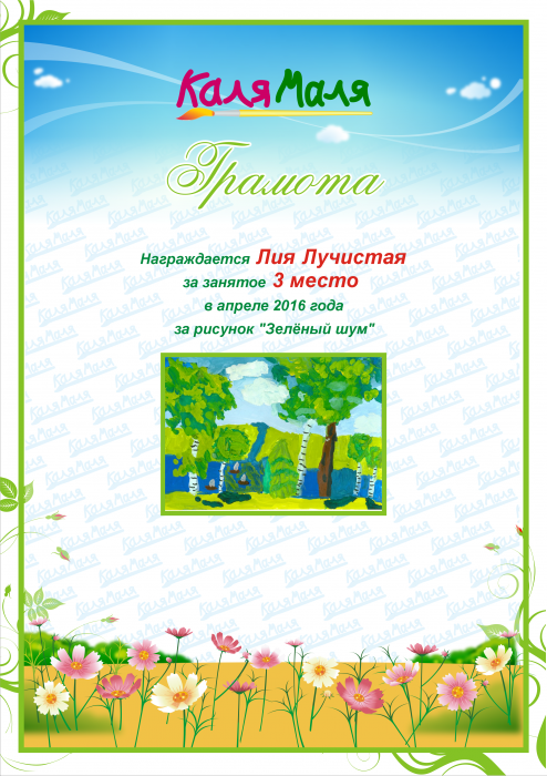 Награждается Лия Лучистая за занятое 3 место в апреле 2016 года за рисунок "Зелёный шум"