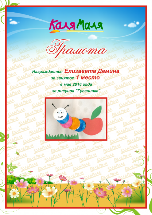 Награждается Елизавета Демина за занятое 1 место в мае 2016 года за рисунок "Гусеничка"