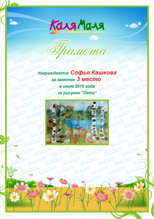 Награждается Софья Кашкова за занятое 3 место в июле 2016 года за рисунок "Лето"