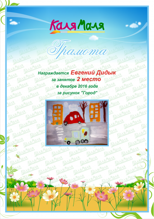 Награждается Евгений Дидык за занятое 2 место в декабре 2016 года за рисунок "Город"