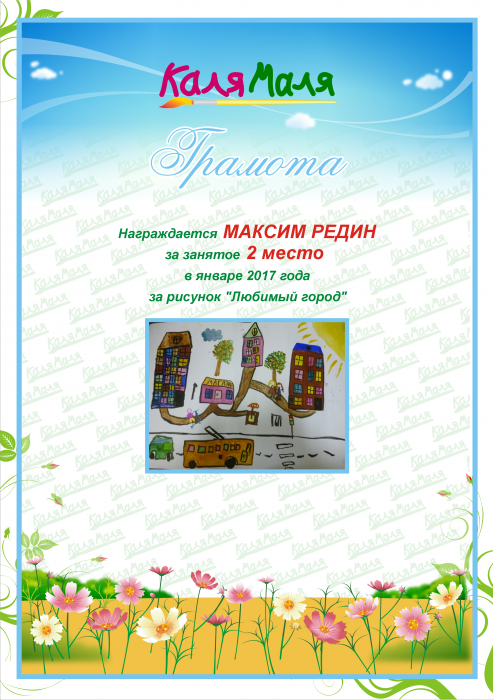 Награждается МАКСИМ РЕДИН за занятое 2 место в январе 2017 года за рисунок "Любимый город"