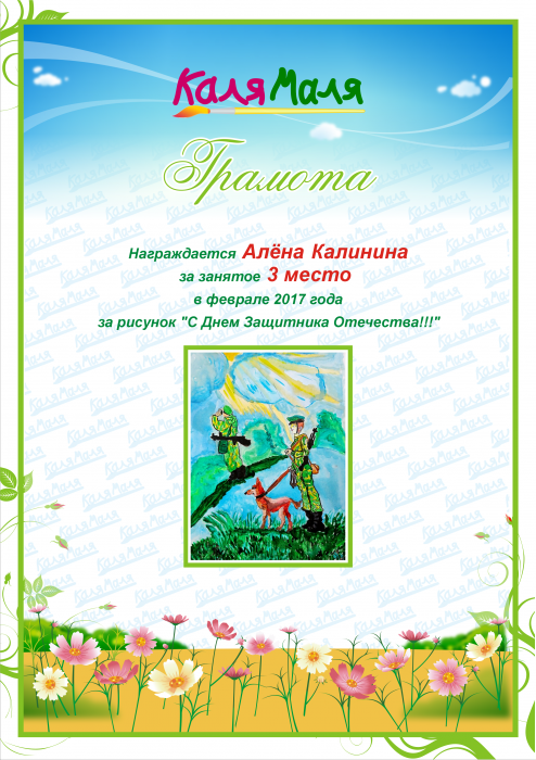 Награждается Алёна Калинина за занятое 3 место в феврале 2017 года за рисунок "С Днем Защитника Отечества!!!"