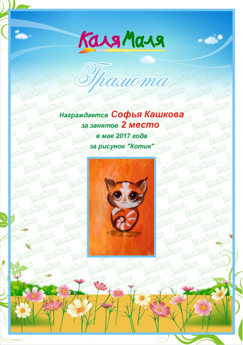 Награждается Софья Кашкова за занятое 2 место в мае 2017 года за рисунок "Котик"