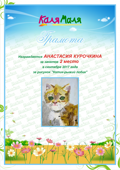 Награждается АНАСТАСИЯ КУРОЧКИНА за занятое 2 место в сентябре 2017 года за рисунок "Котик-рыжий лобик"