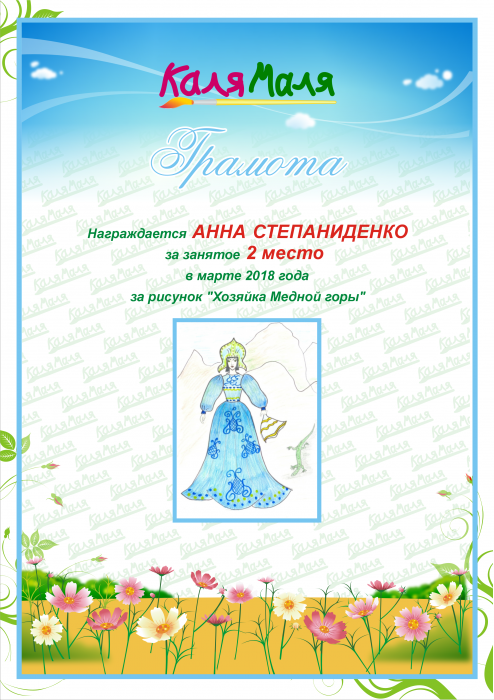 Награждается АННА СТЕПАНИДЕНКО за занятое 2 место в марте 2018 года за рисунок "Хозяйка Медной горы"