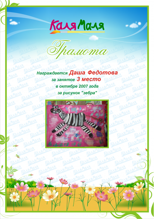 Награждается Даша Федотова за занятое 3 место в октябре 2007 года за рисунок "зебра"