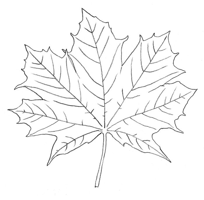 Нарисуем осенний кленовый лист. У него неровные острые края. Обратим внимание, что у листика семь жилок (длинных линий), которые начинаются с одной точки.